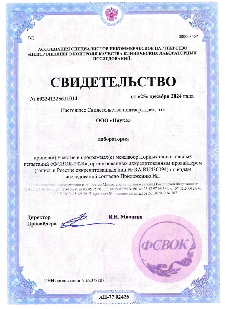 Более, чем за 10 лет лаборатория «Наука» завоевала безупречную репутацию качества лабораторных исследований. Лаборатория ежегодно участвует в программах оценке качества исследований — это программа ФСВОК (Федеральная система внешней оценки качества) и международная программа EQAS (External Quality Assurance Service). В рамках этих программ лаборатория получает различные сыворотки крови (или другой биоматериал) с неизвестными для сотрудников концентрациями аналитов (гормонов, ферментов, онкомаркеров и др.). В лаборатории определяют уровень аналитов своими методами, после чего отсылают данные для сравнения с эталоном. Результаты этих контрольных испытаний и сертификаты качества размещены на этой страничке.