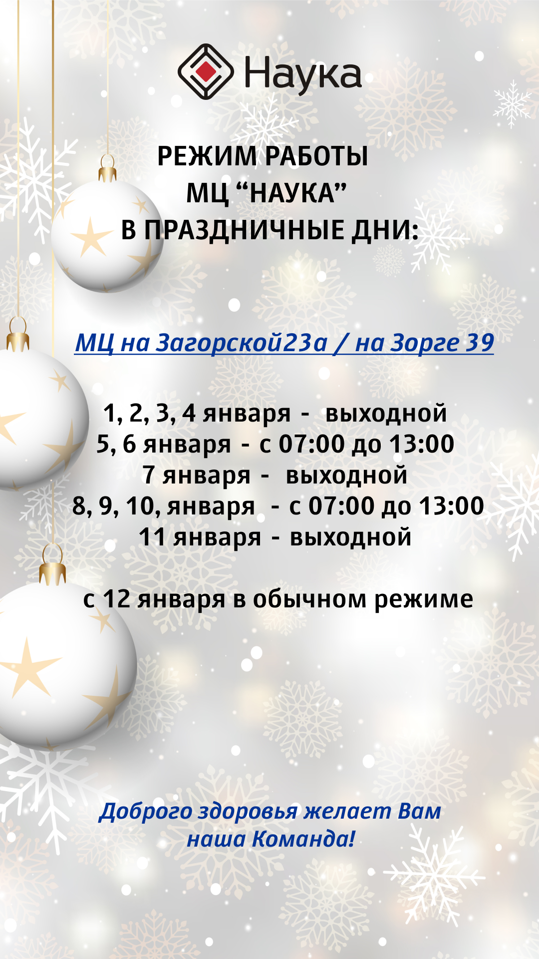 Друзья, информируем Вас о режиме работы медицинских центров "Наука" по адресам: